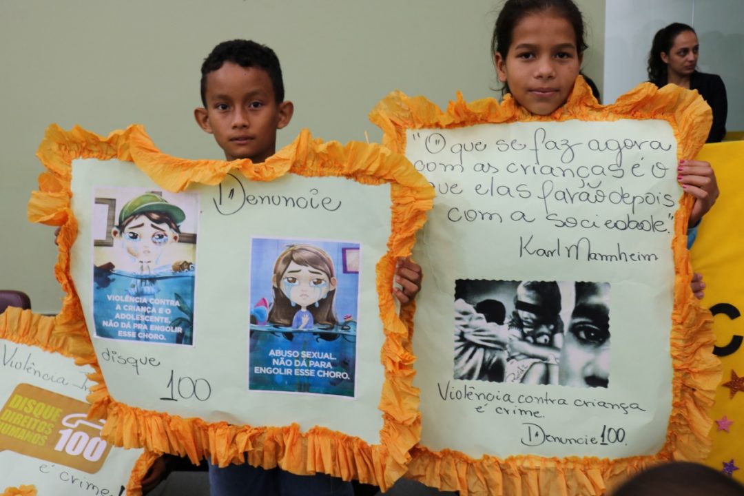 Antes da abertura das palestras, as crianças do Projeto da Primeira à Melhor Idade – Fortalecimento de Vínculo – se apresentaram com cartazes e frases de impacto com objetivo de conscientizar sobre o assunto.