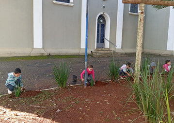 Após o plantio, o sr. Lolli ensinou as crianças sobre a importância desse plantio e destacou que eles estão contribuindo também com a Campanha da Fraternidade que tem como tema “Fraternidade e Ecologia Integral”.