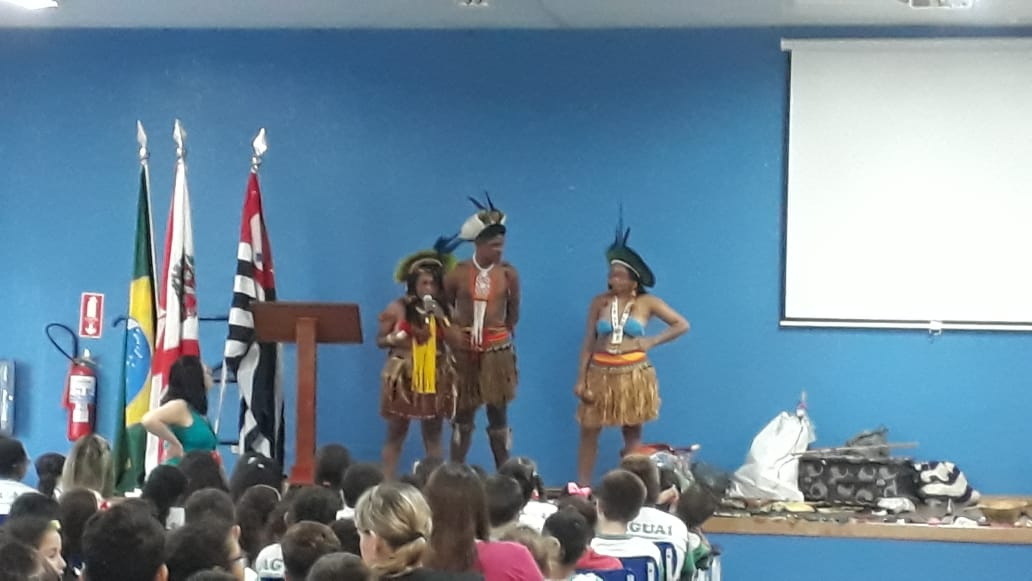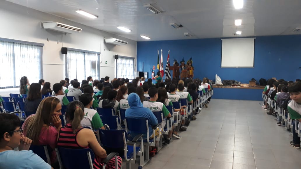 Cerca de 1.200 alunos da Escola Joaquim Giraldi receberam a visita de Indígenas Pataxós no auditório da escola na última segunda-feira (08). Os convidados deram uma aula de história diferente aos estudantes, trazendo peculiaridades significativas ao conhecimento.