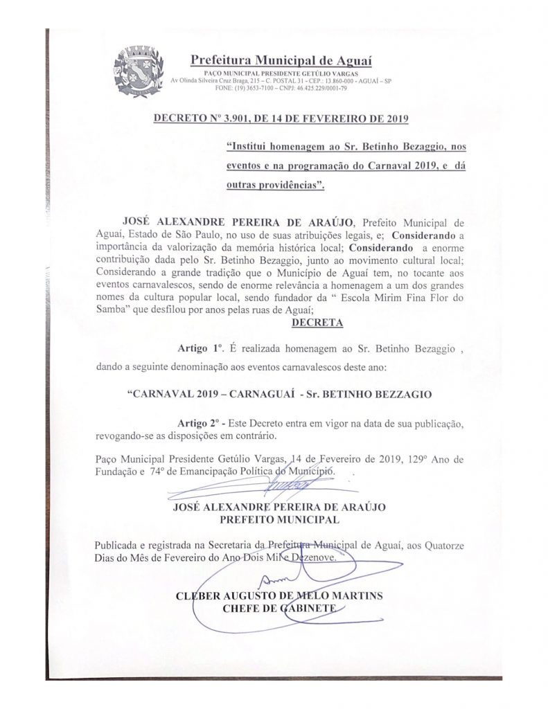 A Prefeitura Municipal homenageia esse ano uma figura muito querida e histórica da cultura carnavalesca aguaiana. Considerando a contribuição dada às festividades anteriores, junto ao movimento cultural local, Betinho Bezzagio foi o escolhido para ser homenageado no CarnAguaí 2019.