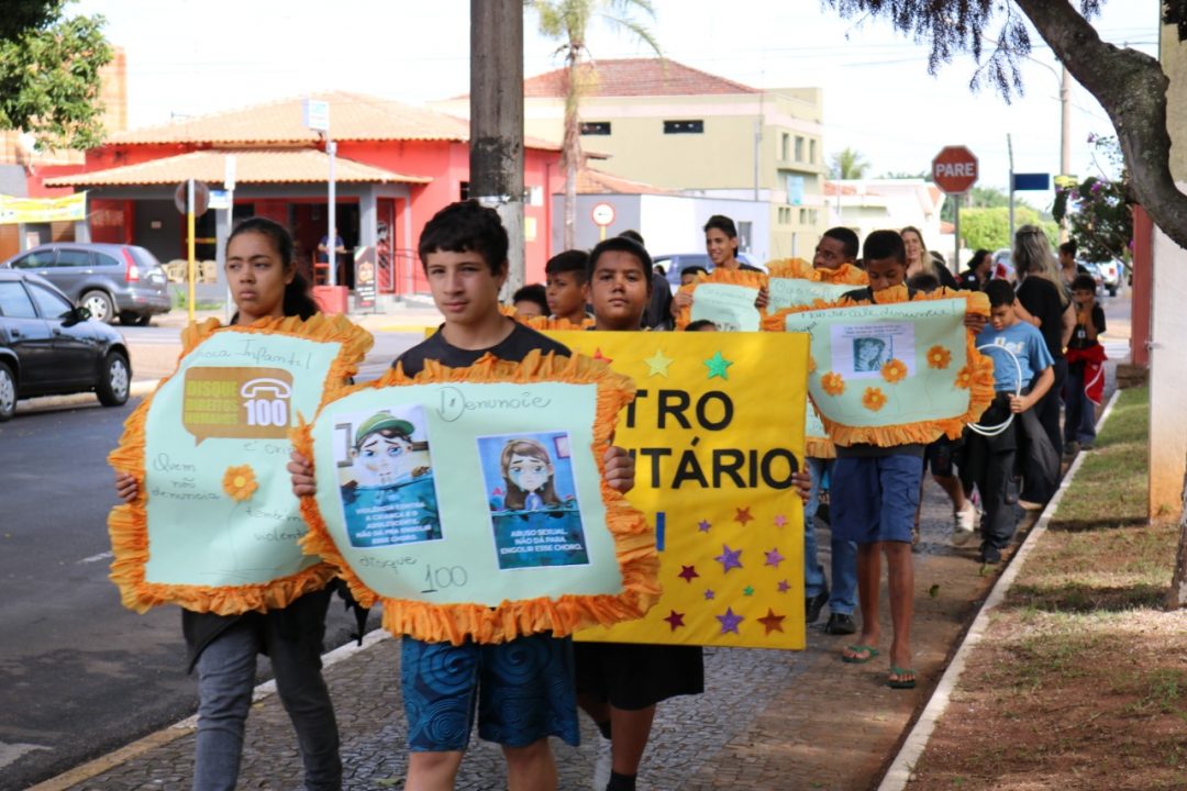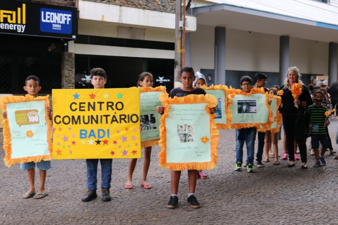 As crianças que participam dos projetos promovidos pelo Centro Comunitário BADI, realizaram uma pequena performance no centro de Aguaí. A mobilização faz parte das ações promovidas pela Secretaria de Desenvolvimento Social e Família em prol ao maio Laranja, que é o mês do Combate ao Abuso e à Exploração Sexual contra Crianças e Adolescentes.