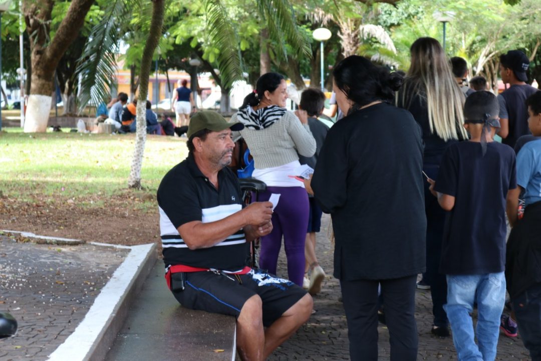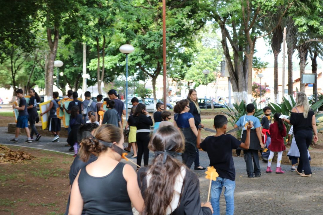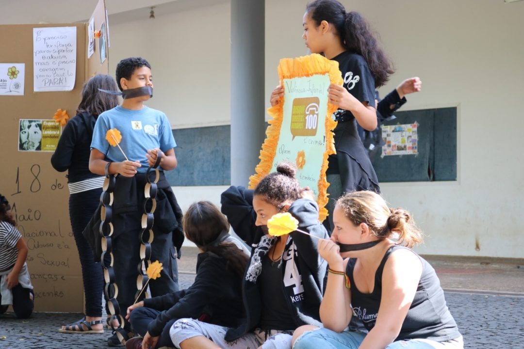 Com tarjas na boca, trajes em luto e semblante triste, os alunos do projeto “Fortalecimento de Vínculo” se posicionaram em frente ao Cine Teatro Esmeralda e entregaram folhetos, expuseram cartazes e ofereceram flores de papel na cor laranja às pessoas que passaram por ali. O intuito era retratar a angústia das crianças e adolescentes que sofrem com o abuso, violência e exploração sexual e conscientizar as pessoas sobre a importância desse assunto.