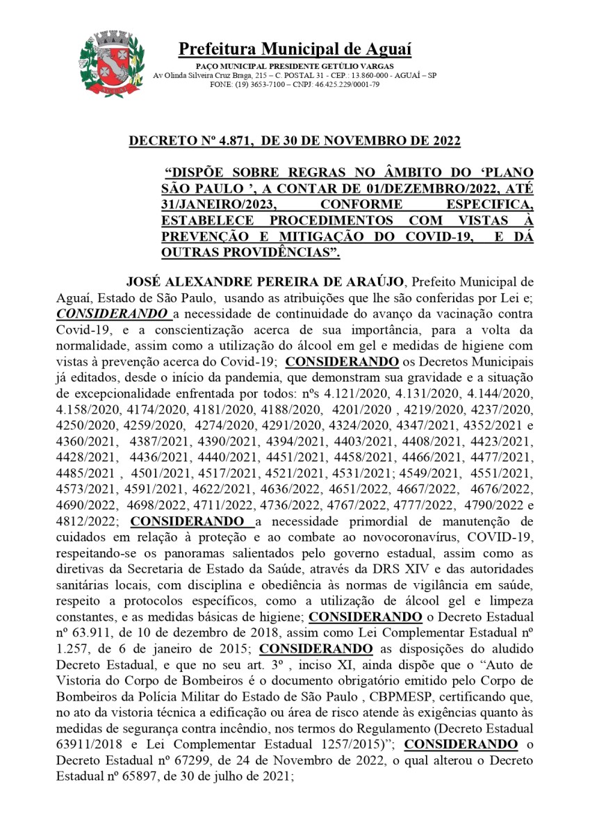 DECRETO Nº 4.871, DE 30 DE NOVEMBRO DE 2022 “DISPÕE SOBRE REGRAS NO ÂMBITO DO „PLANO