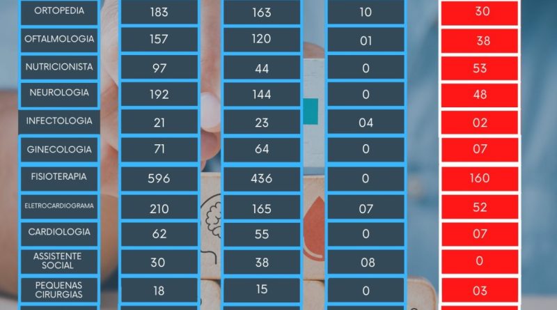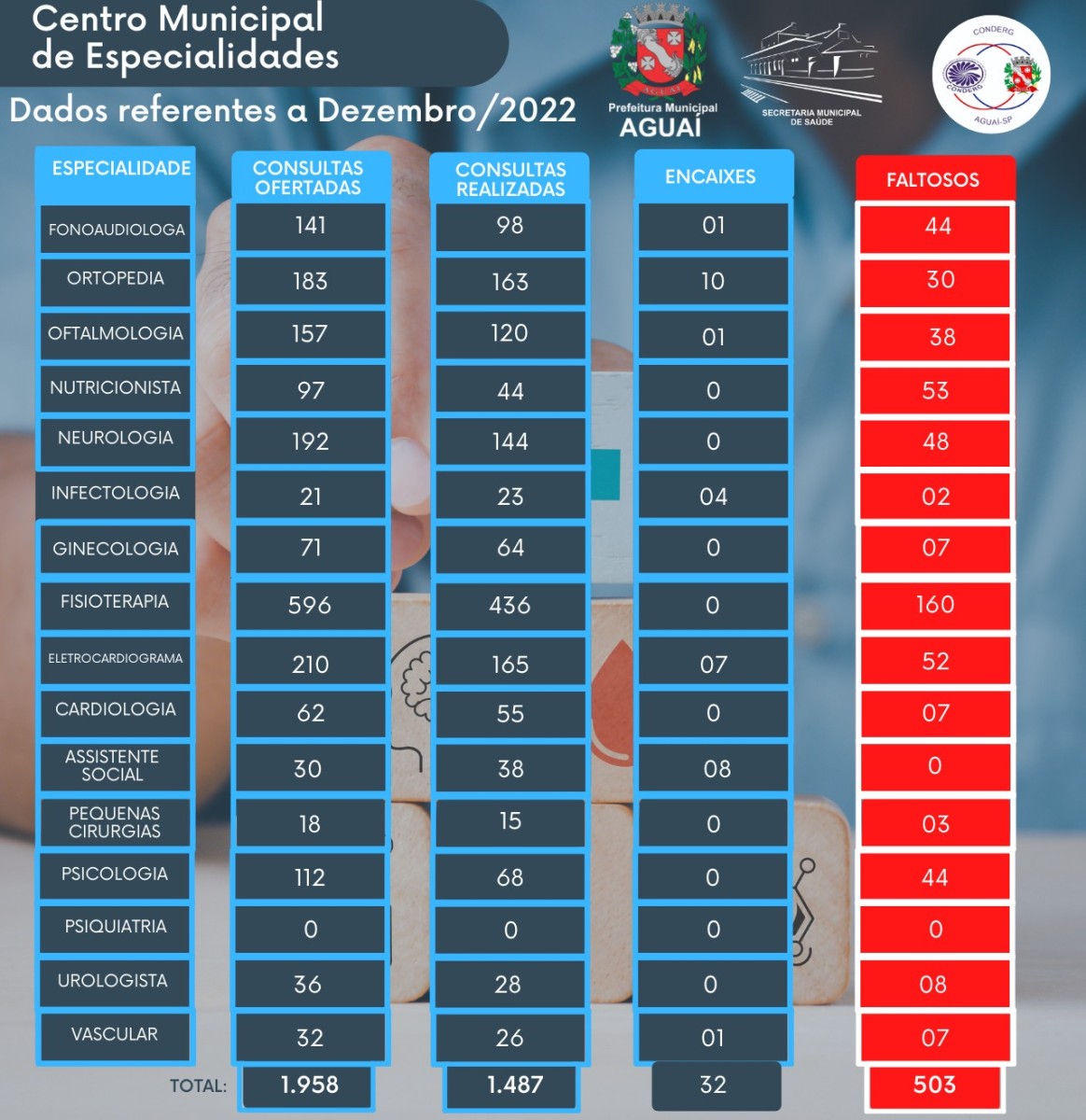 Somente no mês de dezembro 503 pessoas deixaram de ir se consultar nas mais variadas áreas. Foram 07 faltantes em Cardiologia, 48 em Neurologia, 38 em Oftalmologia, 30 em Ortopedia, 44 em Psicologia, 53 em Nutrição, 160 em Fisioterapia,07 em Ginecologia, 03 em Pequenas cirurgias, 02 em Infectologia, 44 em Fonoaudiologia,08 em Urologia, 07 em Vascular e 52 que deixaram de ir realizar seu exame Eletrocardiograma.