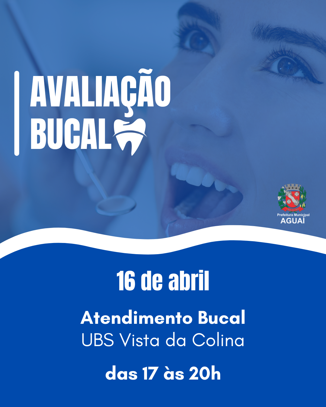 A Prefeitura de Aguaí, por meio da Secretaria de Saúde, fará na próxima quarta-feira, 16, uma ação de avaliação bucal destinada à população aguaiana e que acontecerá na Unidade de Saúde do Vista da Colina, localizada na R. Valter de Freitas Serrate, 407, das 17hs às 20hs.