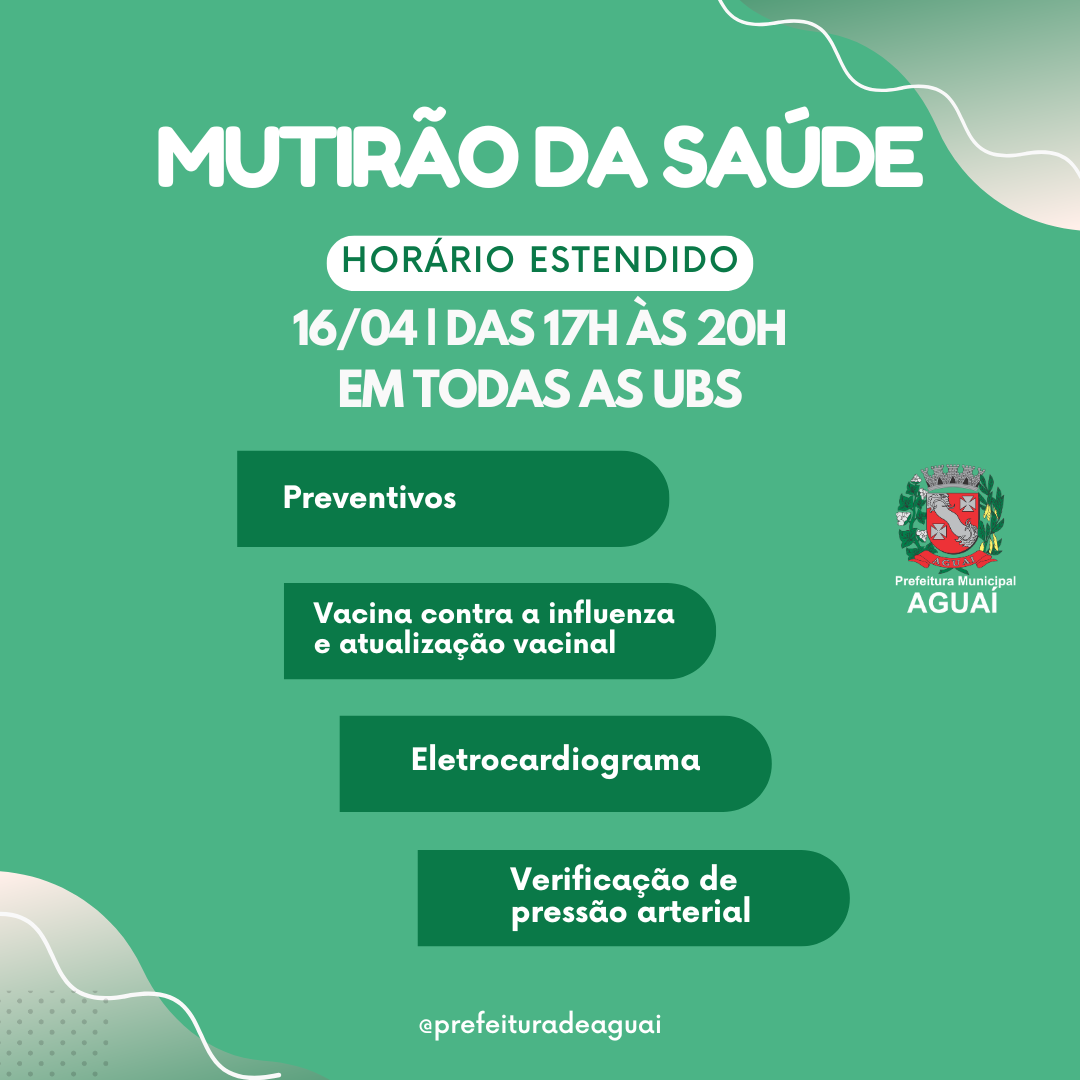 A Prefeitura de Aguaí, por meio da Secretaria de Saúde, fará na próxima quarta-feira,16, um Mutirão de Saúde. Todas as Unidades do município estrão abertas em horário estendido, das 17hs às 20hs, para a realização dos seguintes serviços: Vacinação contra a Influenza para o público alvo, coleta de preventivo para as mulheres, realização de eletrocardiograma e verificação de pressão arterial.