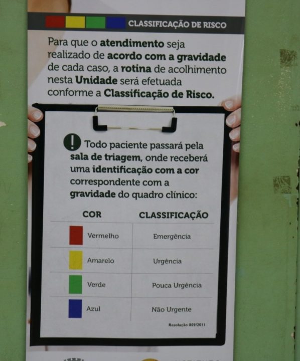 O sistema de classificação dos pacientes é baseado no modelo de Manchester, adotado internacionalmente. Segundo esse protocolo, os pacientes classificados nas cores verde azul, podem esperar um tempo maior para o atendimento.