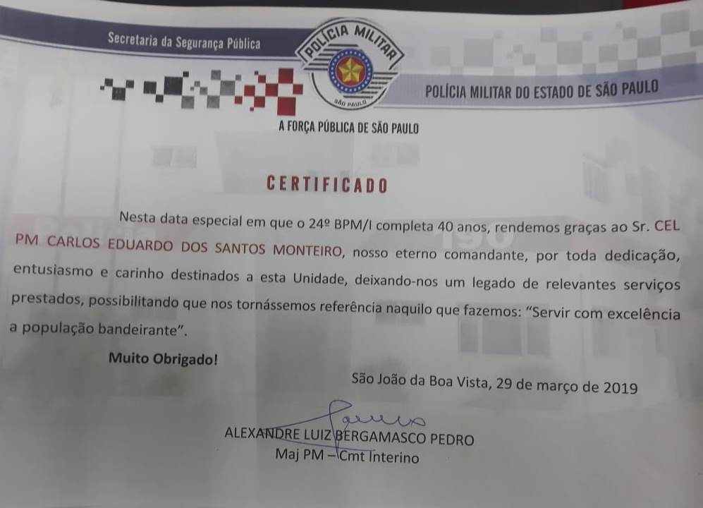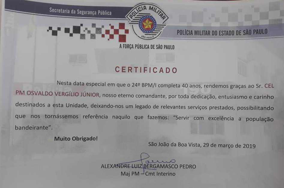 O Major PM Alexandre Luiz Bergamasco Pedro, Comandante Interino do 24º BPM/I, entregou um certificado aos eternos comandantes do Batalhão. O coronel Osvaldo Vergílio Júnior fez carreira no 24 º BPMI entre os anos de 1988 e 2012. Já o coronel Carlos Eduardo dos Santos Monteiro esteve no Batalhão de 1992 a 2017.