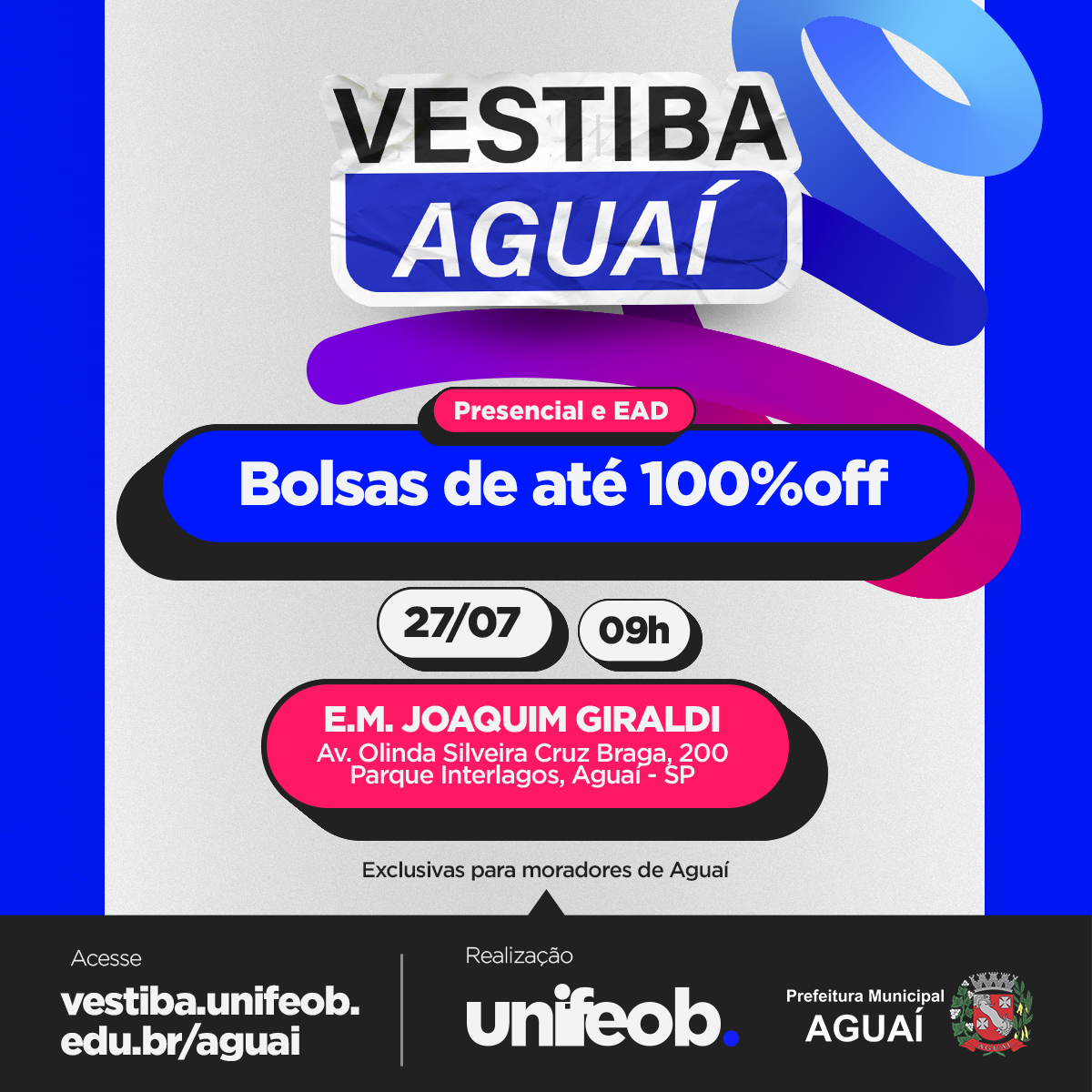 O Vestiba de Bolsas Aguaí da Unifeob oferece bolsas de 50% e 100% para quem for bem na prova. Os melhores colocados serão contemplados. Isso é possível após uma parceria entre a Prefeitura de Aguaí e a Unifeob, permitindo com que todos tenham acesso ao ensino superior.